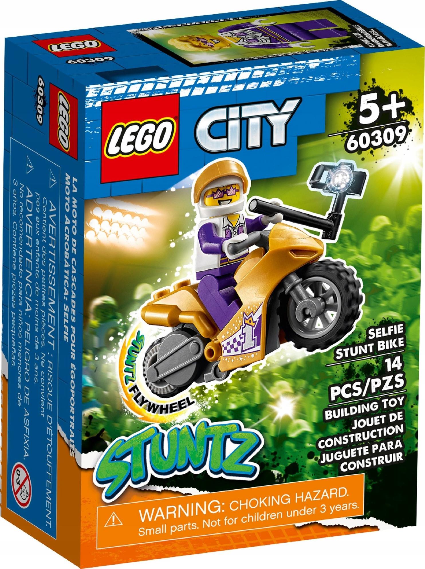 - LEGO® City Selfie s kaskaderskim motorjem (60309) omogoča otroški domišljiji prosto pot, ko se igrajo s motorjem na vztrajnik in minifiguro ekstravagantnega Spotlighta iz TV-serije LEGO City.