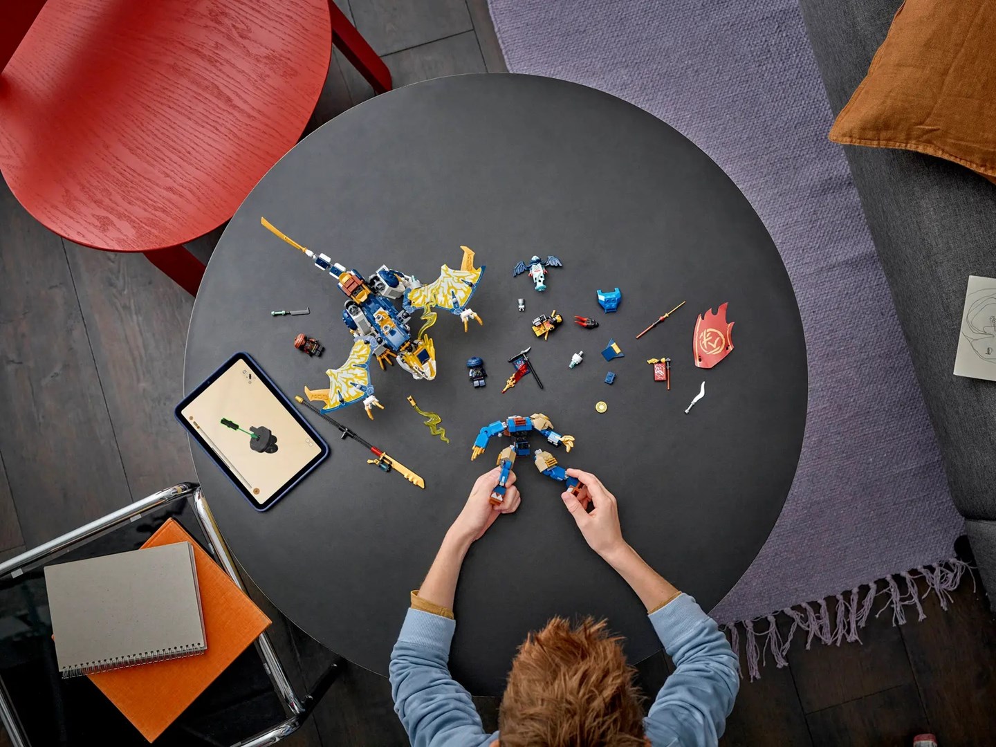 Rogueov mehanizirni jezdec zmajev (71843) je sestavljiva igrača, ki fantom in dekletom, starim osem let in več, omogoča, da poustvarijo prizore iz tretje sezone TV-serije NINJAGO® Vzpon zmajev. Otroci se lahko igrajo z robotom in prvim NINJAGO Zmajevim robotom, nato pa ju združijo in ustvarijo čudovitega Rogue, robota jezdeca zmajev. Rogue ima gibljive roke in noge, odpirajoč se trup za minifiguro in meč, figura zmaja pa ima gibljiva krila, glavo, smrček, noge, rep in meč. Komplet dopolnjujejo štiri minifigure: ninja bojevnika Rogue in Arin ter zlobni dvojec Rox in spektralni zmajski bojevnik, ki vsak drži transparent s skrivnim sporočilom, ki ga je mogoče prebrati le z Arinovim mečem razodetja. Otroci lahko na hrbtno stran figure zmaja, ki je vključena v ta komplet, pritrdijo robote iz kompletov Kaijev robot jezdeca nevihte (71830) in Kaijev robot jezdeca EVO (71783) (naprodaj ločeno). Komplet je mogoče sestaviti z aplikacijo LEGO® Builder, ki vas in vašega otroka vodi skozi gradbeno pustolovščino. Komplet vsebuje 584 kosov.