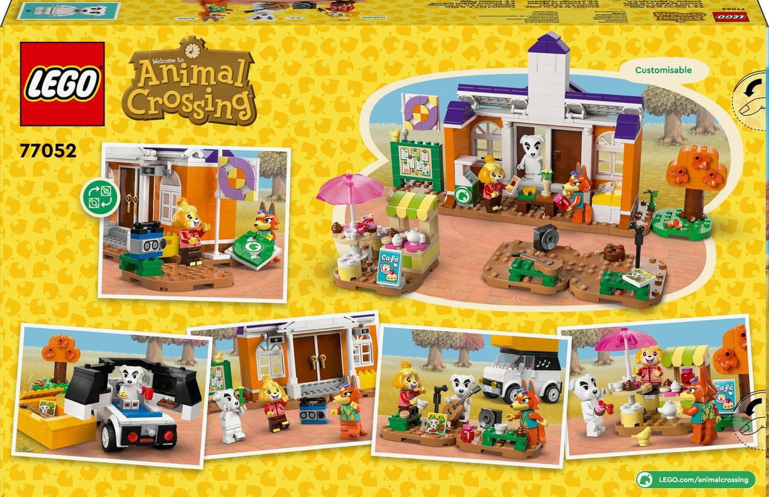 Deklice in dečki, stari od 7 let naprej, si lahko s K.K. in koncertom na trgu (77052) ustvarijo lastne zgodbe, ki jih je navdihnila serija videoiger Animal Crossing™. Najprej zgradijo prizore iz videoiger, nato pa se lahko igrajo s 3 minifigurami LEGO® Animal Crossing in številnimi znanimi dodatki iz serije videoiger, kamorkoli jih bo odpeljala domišljija! Celoten opis