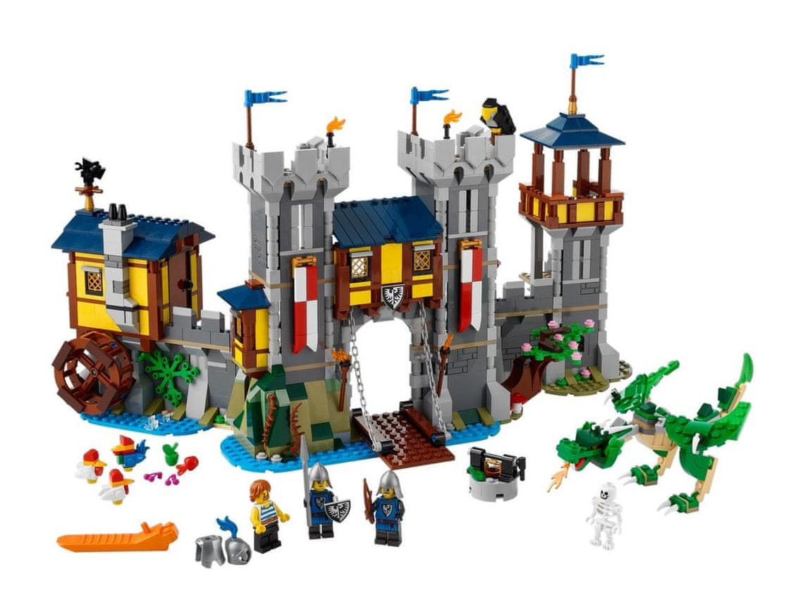 Otrokom omogočite, da se vrnejo v preteklost s podrobnim dodelanim kompletom srednjeveškega gradu iz LEGO® Creator 3 v 1. Ponuja številne podrobnosti, s katerimi bodo doživeli nešteto vznemirljivih dogodivščin – dvonadstropni grad z odpiralnimi vrati, vodnim kolesom, ječo, kraljevsko sobo, 3 minifigure, zmajev model, 3 piščance in podgano. Poleg tega je mogoče odpreti zadnji del modela. Celoten opis