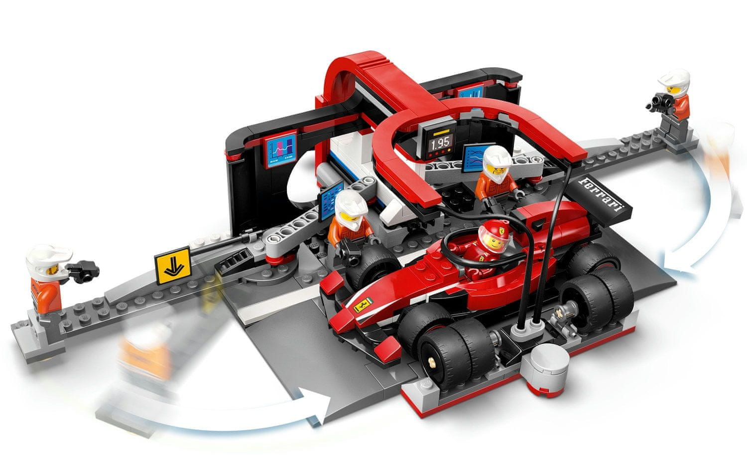 • Postanek v boksih F1® s Ferrarijem, voznikom in 4 minifigurami posadke