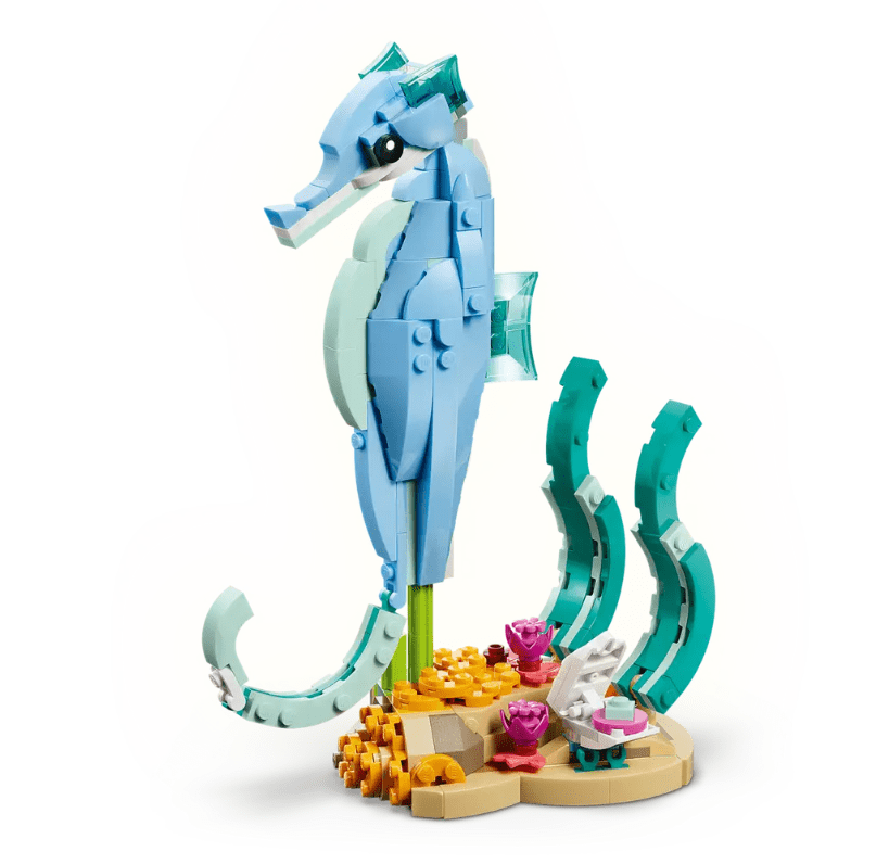 Komplet LEGO Creator Morske živali: Čudoviti delfini (31385) prinaša val ustvarjalne zabave za otroke od 9. leta starosti naprej. Z istimi kockami lahko sestavijo dinamičen prizor delfina in mladiča na valu, ki ga kasneje preoblikujejo v morskega konjička ali rakovico z morskimi detajli. Vsak model ima svoje razstavno dno, kar omogoča, da te živali postanejo pravi okras v sobi.