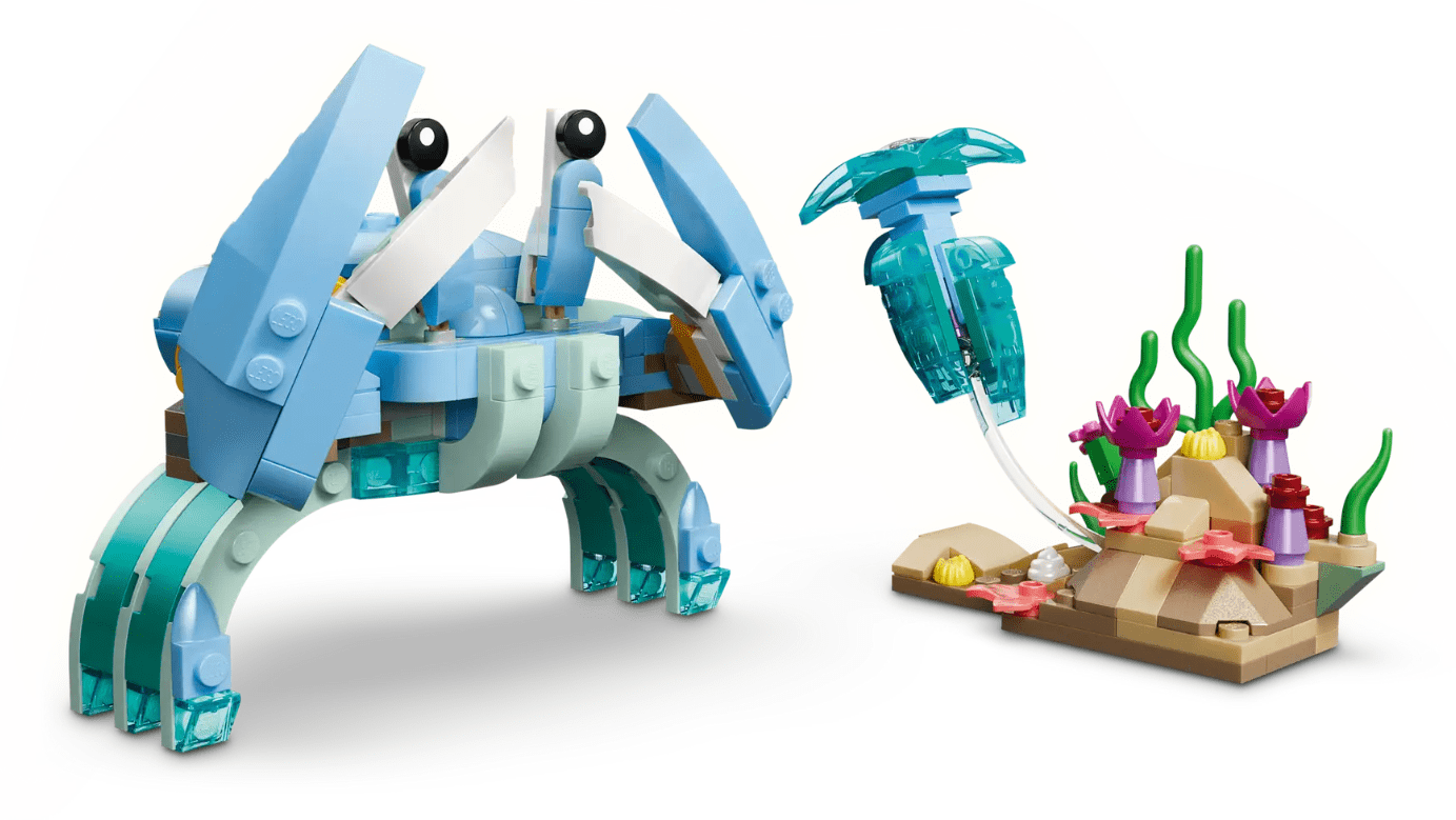 Glavna zvezda seta sta odrasel delfin in njegov mladič s premikajočimi se telesi, ki plavata na valu nad koralnim grebenom. Otroci pa ju lahko predelajo v elegantnega morskega konjička na stojalu z algami in školjko ali v simpatično rakovico, ki se druži z meduzo. Vsi trije modeli vključujejo morsko dno ali stojalo.