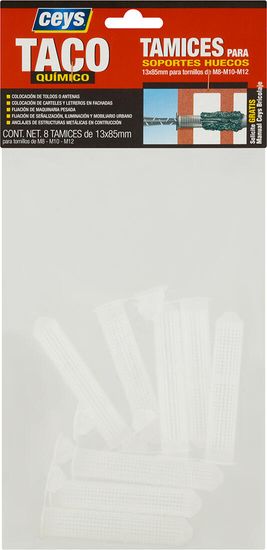Ceys kemično sidrno cedilo 13×85mm (8 kosov) Sito vstavite v luknjo, ki jo boste zatesnili s kemičnim sidrom. Nato nanesemo sidro in zaradi sita ustvarimo zelo trden spoj. Primerno za opeko, predelne stene, stene, mizarska okna in vrata. Velikost: 13×85 mm Celoten opis