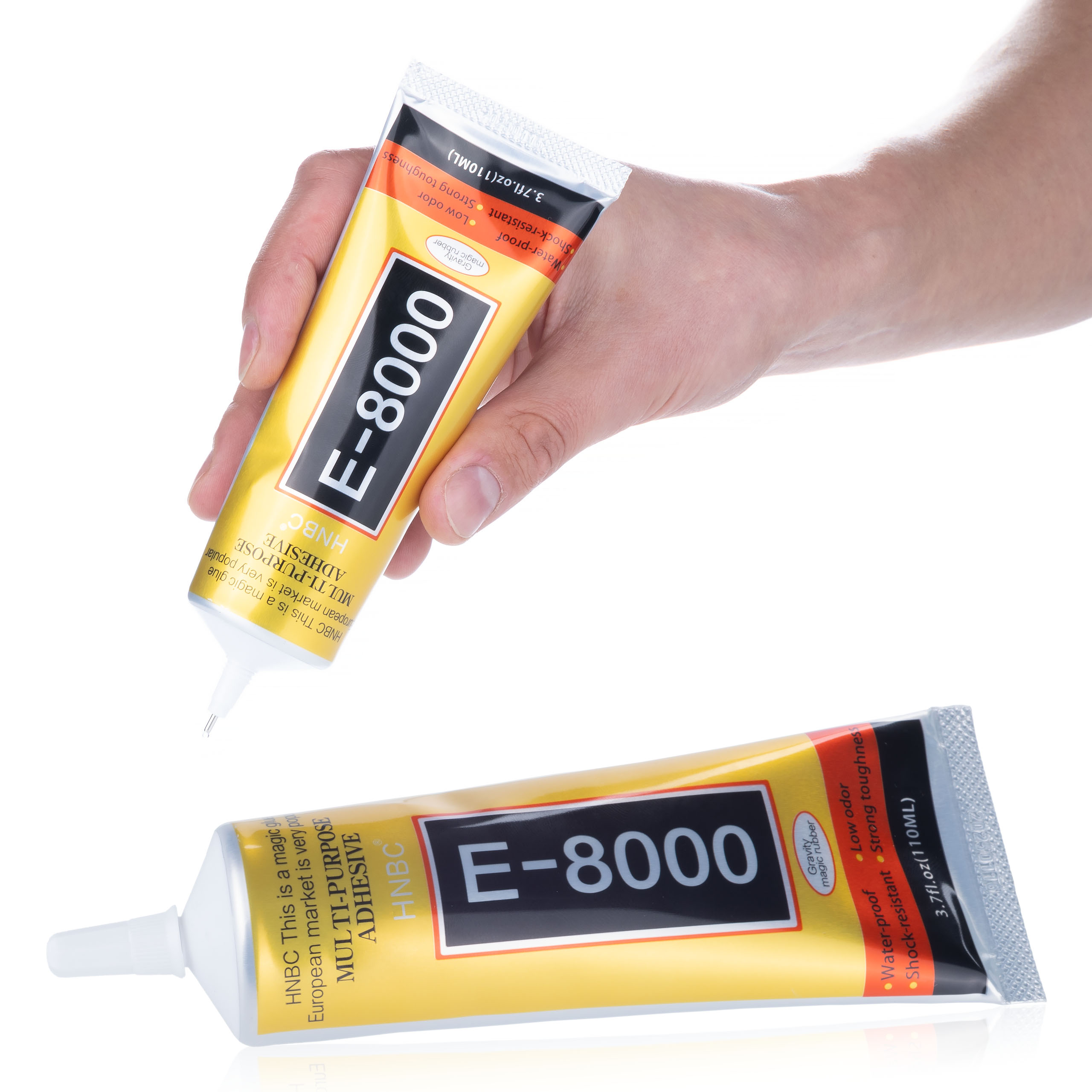 - Popravila elektronike: E-8000 110ml je idealno za popravilo mobilnih telefonov, tabličnih računalnikov, prenosnih računalnikov, elektronskih aparatov in drugih elektronskih naprav. Zahvaljujoč natančni aplikatorski konici lahko natančno nanesete lepilo na občutljivo elektroniko, kot so žice, mikroswitchi ali majhne komponente vezja.