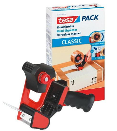 Tesa® Classic Manual Dispenser je zasnovan za hitro in enostavno zapiranje transportnih kartonov. Primeren za vso samolepilno embalažo tesapack® in kartonske tesnilne trakove do širine 50 mm, ta podajalnik združuje trdno kovinsko ohišje in ergonomsko profiliran plastični ročaj s preizkušeno tehnologijo za natančne rezultate tesnjenja. Gumijast valj z vzmetno loputo, ki pritiska na trak, zagotavlja popoln oprijem. S prilagajanjem napetosti traku lahko ročni podajalnik tesa® Classic „nastavite“ na vrsto uporabljenega traku. Trdno kovinsko ohišje zagotavlja vzdržljivost Nastavljiva napetost traku Gumijast valjček za enostavno nanašanje traku Elastična loputa, ki pritiska na trak Trak ni vključen v kompletu