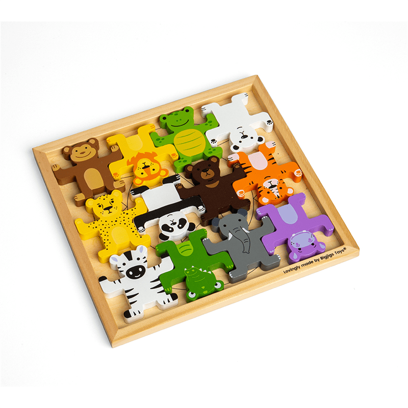 Dvanajst lesenih figur živali, s katerimi lahko igrate igro ravnotežja. Figurice preprosto postavite eno na drugo. Katera figura pade, izgubi. Razvija spretnost, fino motoriko, ustvarjalnost in domišljijo. Živali so trpežne, izdelane iz masivnega lesa, popolne velikosti, da jih lahko primejo majhne roke. Primerno za potovanje. Izdelane so iz visokokakovostnih, odgovorno pridobljenih materialov, ki ustrezajo veljavnim evropskim varnostnim standardom. Glavneznačilnosti: trenira potrpežljivost in logično razmišljanje živali – medved, lev, žaba, opica, leopard, krokodil, slon, tiger, hrošč, polarni medved, panda in zebra-odporen, izdelan iz masivnega lesaprimeren od 1 leta starosti