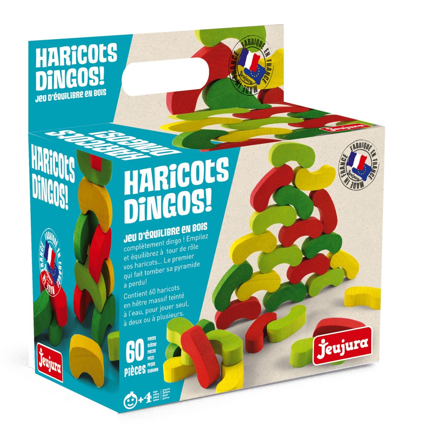 Zložite fižolčke enega na drugega tako, da bo fižolček na vrhu vedno drugačne barve kot par pod njim. Kdor zruši stavbo, izgubi. Z igro vadite fino motoriko in koncentracijo. Izdelano v Franciji iz masivnega bukovega in borovega lesa francoskega porekla. Sestavni deli so obdelani izključno z barvami in laki na vodni osnovi. Pakirano v kartonski škatli, potiskani z rastlinskimi črnili. Glavne značilnosti:60 kosov iz masivnega lesaizdelano v Franciji