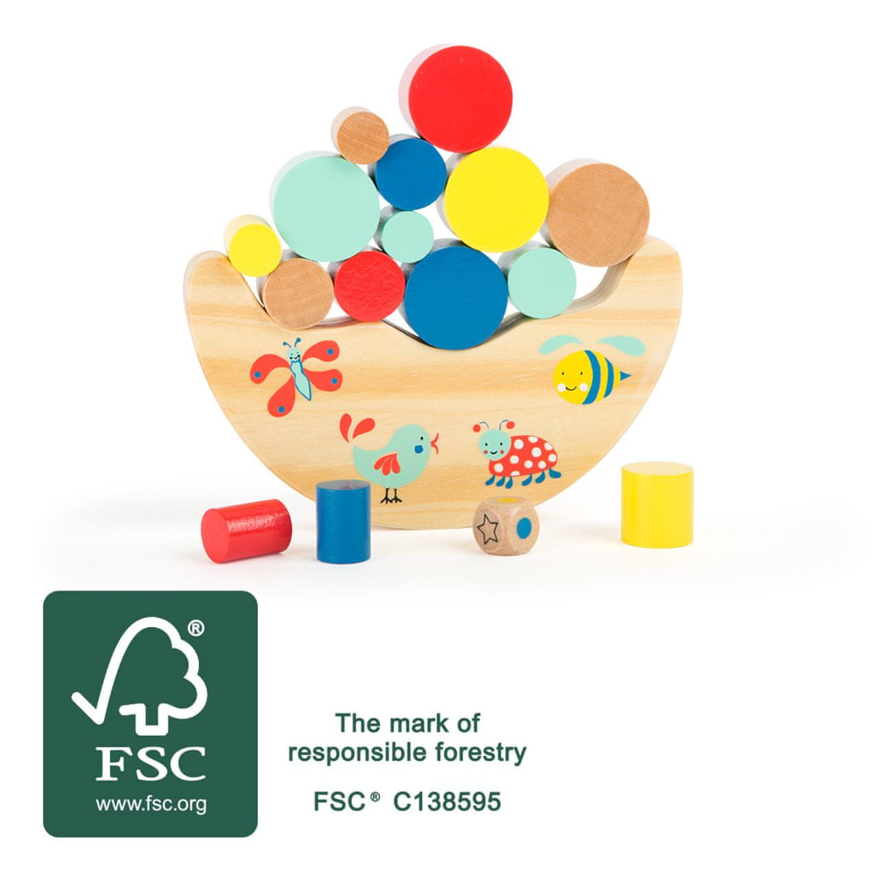 Komu bo uspelo postaviti najvišji stolp? Velik izziv, v katerem je treba vse igralne elemente iz 100 % certificiranega lesa FSC postaviti na zibajočo se gugalnico. Slika prikazuje, kateri kos je postavljen prvi. Glavne značilnosti: razvija otrokovo fino motoriko spodbuja radovednost izdelan iz 100 % lesa FSC Oznaka in certifikat FSC (Forest Stewardship Council) zagotavljata, da les, iz katerega je izdelan izdelek, ni bil nezakonito posekan in prihaja iz gozdov, s katerimi se gospodari na trajnosten ali naravi prijazen način, pri čemer se upoštevajo stroge okoljske in socialne zahteve. Oznaka FSC na izdelku pomeni, da z nakupom prispevate k varstvu gozdov in podpirate trajnostno, odgovorno ali naravi prijazno gospodarjenje, zaradi katerega so naši gozdovi stabilnejši, bolj zdravi, z naravno sestavo vrst in bolje kljubujejo negativnim učinkom podnebnih sprememb.