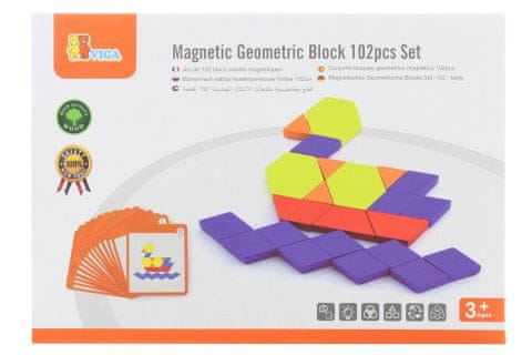 Lesene magnetne oblike. Paket vsebuje skupno 102 kosa magnetnih geometrijskih oblik, kartice (po katerih se lahko slike zlagajo) in praktično vrečko iz blaga za enostavno shranjevanje. Dimenzije paketa približno 26 × 18 × 6 cm. Starost 3+