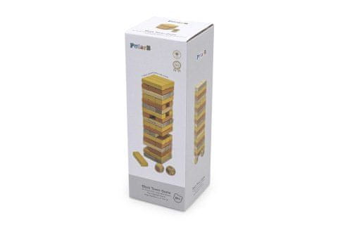Leseni stolp za namizne igre. Paket vsebuje 54 kock velikosti 6×2×1,2 cm in 2 kocki. Cilj igre je odstraniti kocke glede na barve iz stolpa in paziti, da se stolp ne zruši. Velikost paketa je približno 9×25×9 cm. Starost 3+