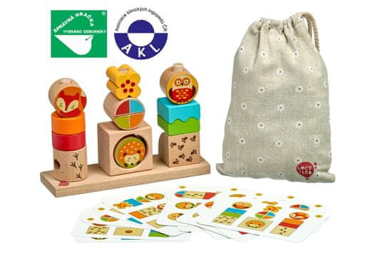 Dan in noč je lesena sestavljanka z živalskimi in geometrijskimi oblikami. Karte s soncem prikazujejo barve sonca, karte z luno in zvezdami pa oblike zvezd. Igra vključuje leseno podlago s tremi okroglimi zatiči, 3 kocke z gozdnimi živalmi, upodobljenimi podnevi na eni in ponoči na drugi strani, ter številne druge kocke različnih barv, oblik in velikosti. Priloženih je tudi 14 obojestranskih kartic s predlogami. Cilj igre je preizkusiti različne postavitve in postaviti vse kocke na žebljičke v skladu s predlogami. Ko je igre konec, lahko sestavljanko pospravite v platneno vrečko, ki je priložena. Sestavljanka je odlična za razvijanje logičnega mišljenja, fine motorike in otroške domišljije. Ta igrača se imenuje pripomoček Montessori.