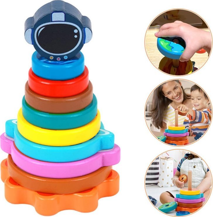 Izobraževalna lesena piramida je idealna igrača za razvoj otrokovih ročnih spretnosti. Naloga je razporediti diske na podlagi od največjega do najmanjšega. Piramida je zaključena z delom v obliki astronavtske čelade.
