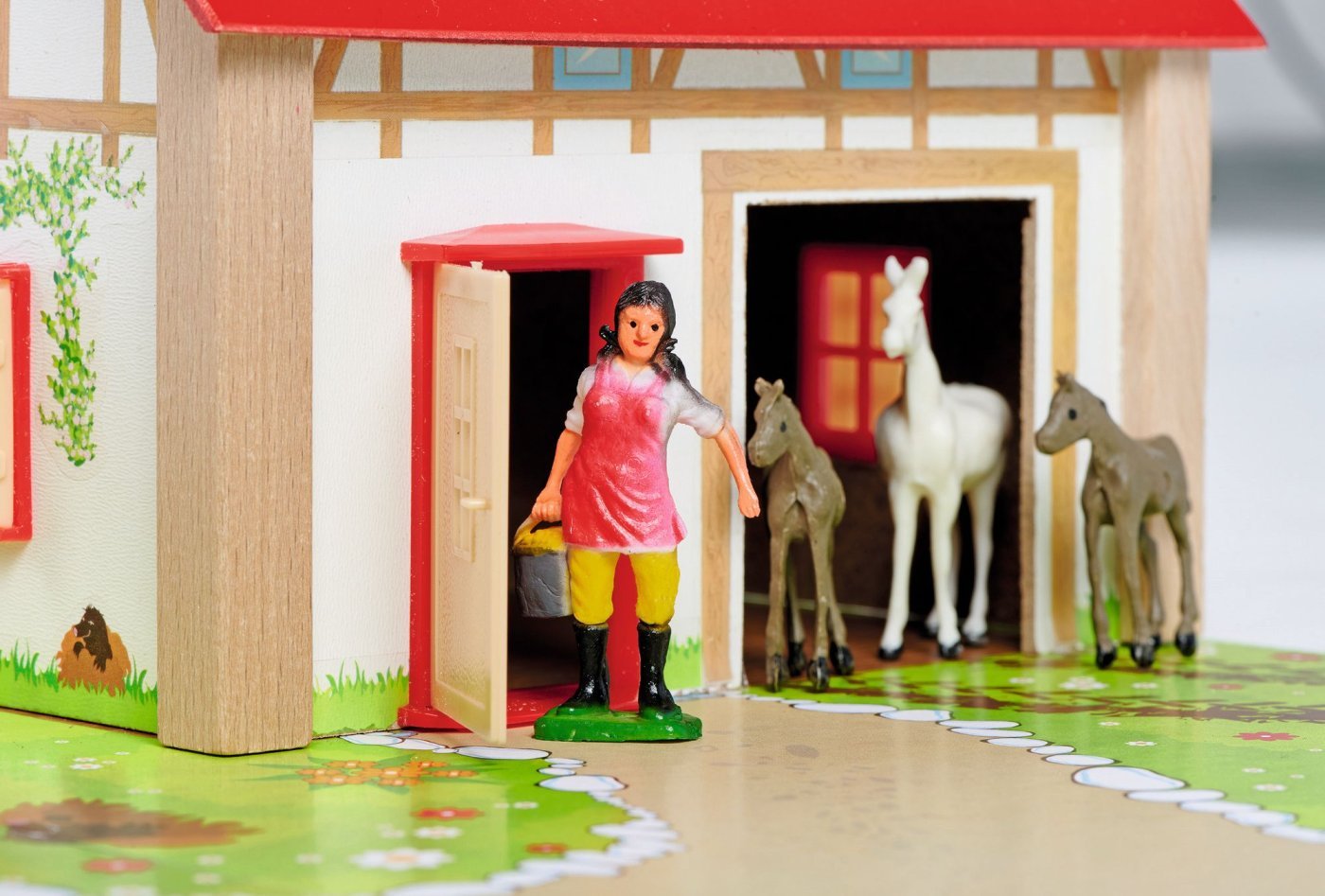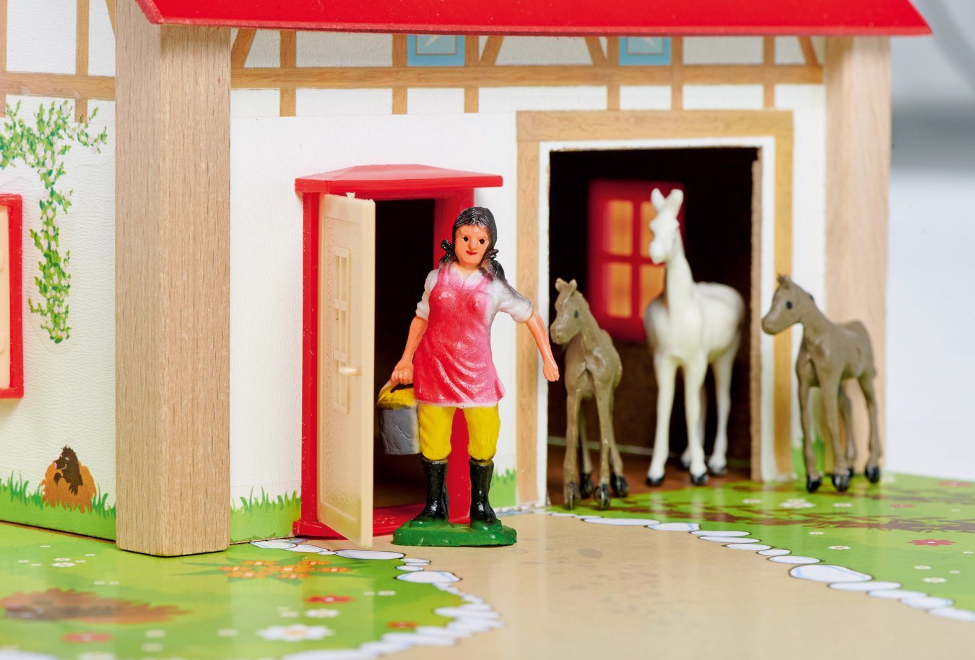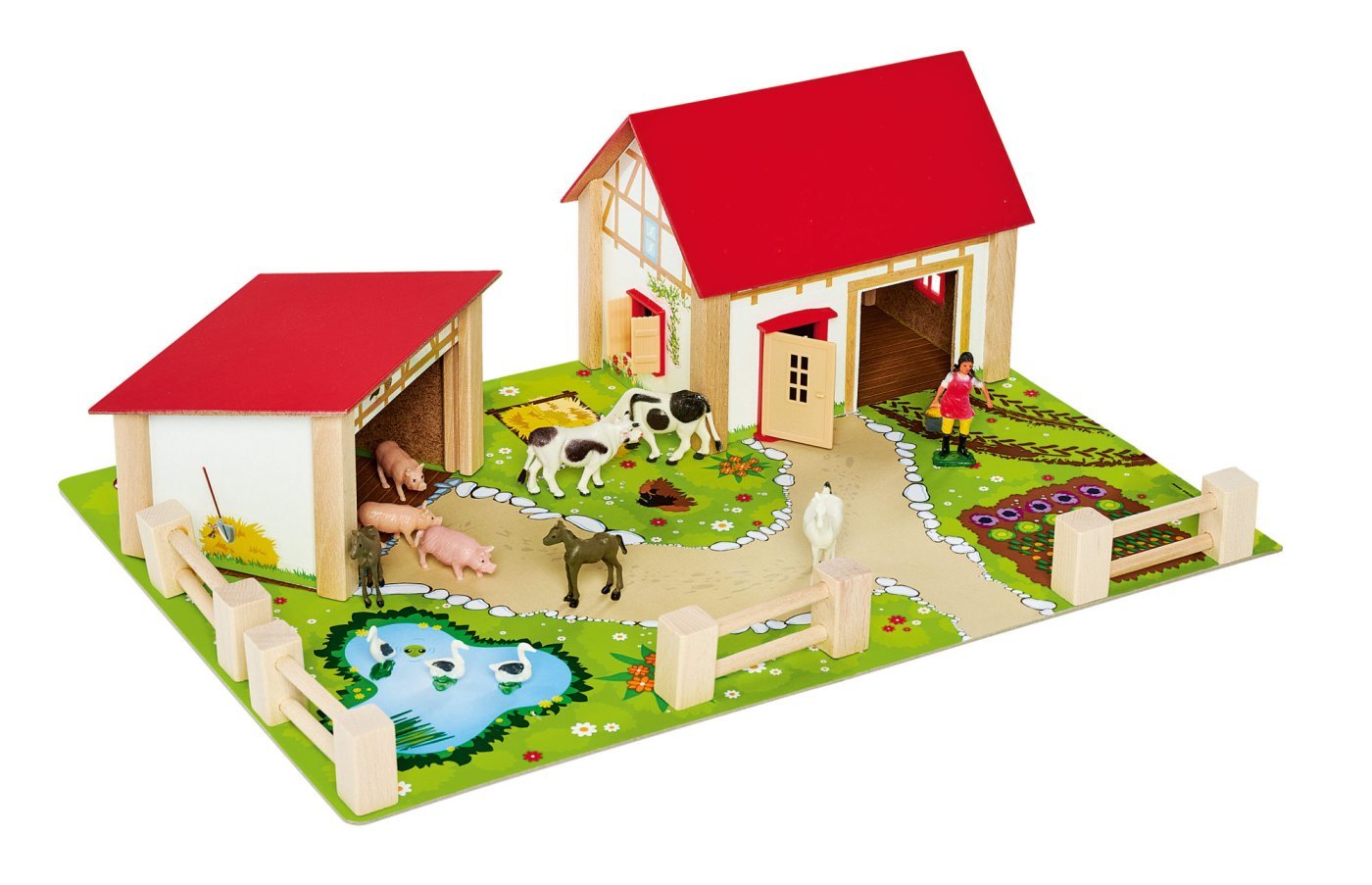 Lesena kmetija vključuje 2 gospodarska poslopji, figure kmetov in živali, ograjo in podstavek v velikosti 36 × 51 cm. Skupaj vsebuje 20 kosov. Višina figure kmeta je 6 cm.