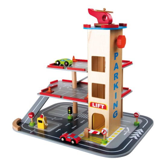 Zabava v treh nadstropjih! Z dvigalom se avtomobili pripeljejo v želeno nadstropje, na heliportu je dovolj prostora za nemoten pristanek helikopterja, v pritličju pa lahko avtomobili natočijo gorivo. Veliko znakov pomaga pri nadzoru prometa. Vključeni so 2 avtomobila, helikopter, 4 prometni znaki in 3 prometni stožci, bencinska črpalka in ovira. Od zdaj naprej bo v igralnici res velik promet. Glavneznačilnosti: 3 nadstropja, povezana z delujočim dvigalom in 2 klančinama12 dodatkovTrajnostna lesena zasnova