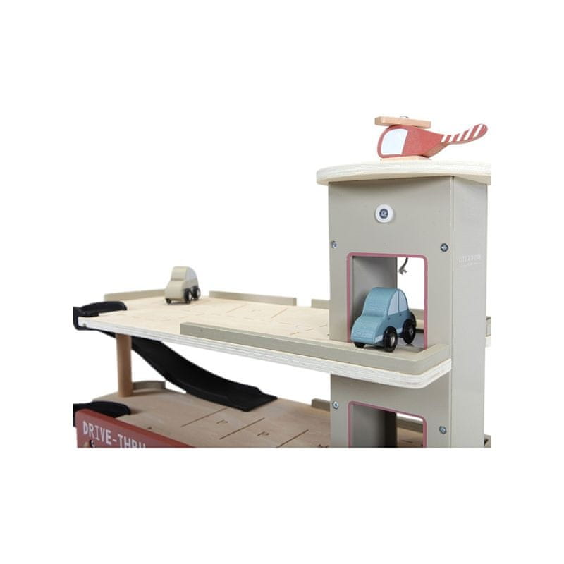 V garažni hiši lahko natočite gorivo, parkirate avto ali ga očistite v avtopralnici. Lesena garaža je eden od številnih igralnih setov, ki jih je mogoče priključiti na vlakovno garnituro Little Dutch XXL. Garaža ima pristajalno ploščad za helikopter, lesene figure pa imajo podrobne ilustracije na obeh straneh. Garažo je mogoče dopolniti z vlakovno garnituro XXL in razširitvenimi kompleti za večurno zabavo.