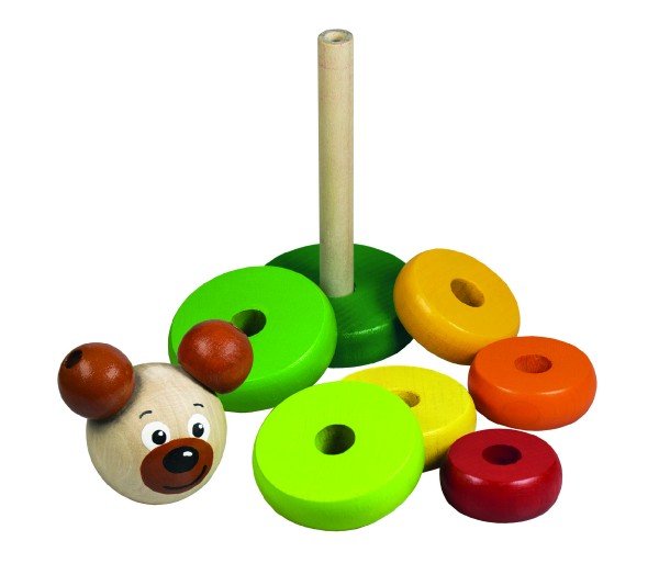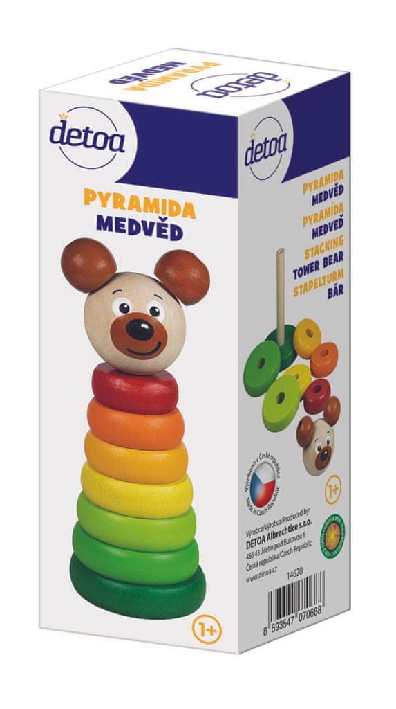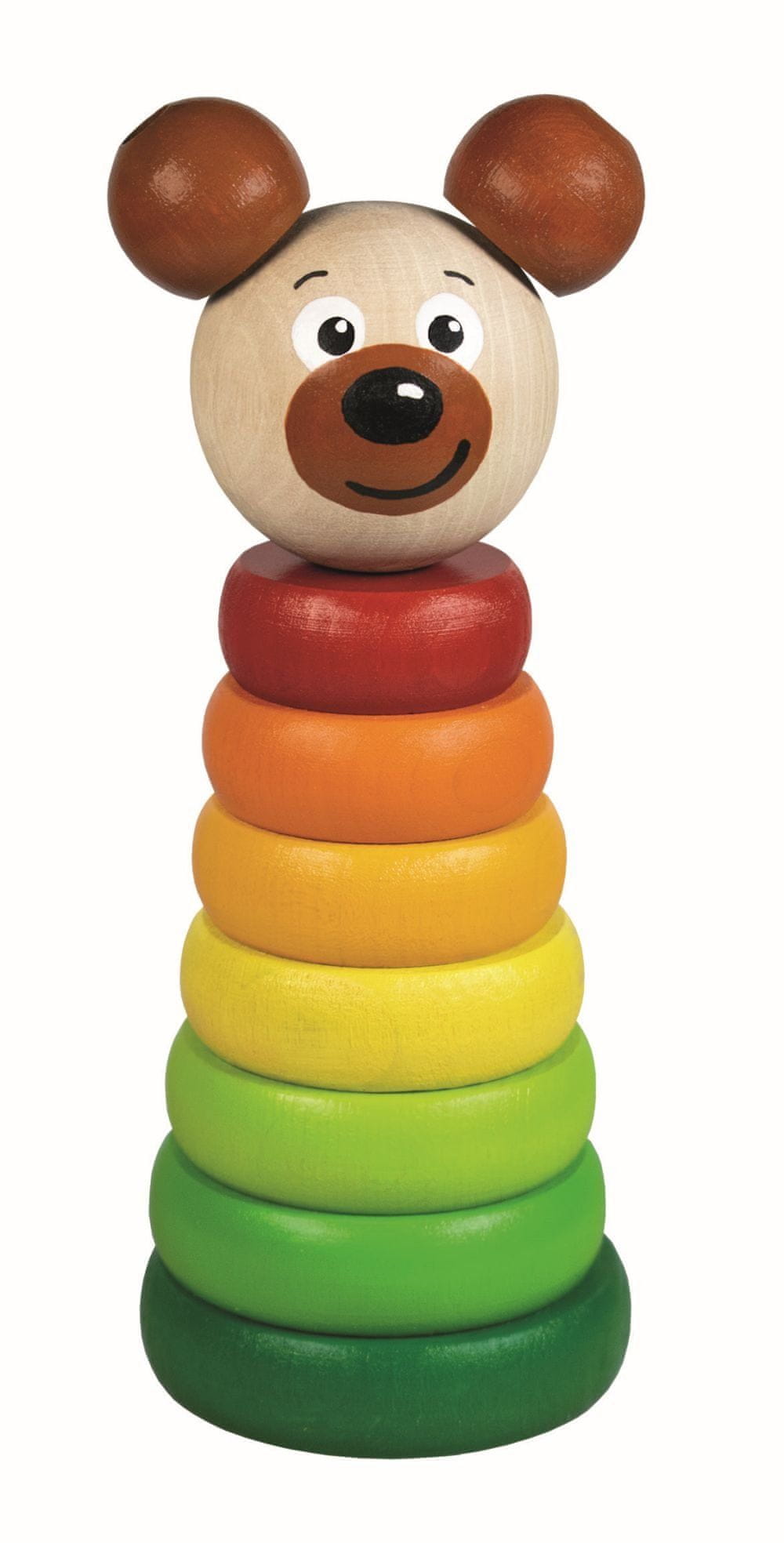 Drevesna zložljiva piramida z motivom medveda razvija otrokovo domišljijo, logično mišljenje in motorične sposobnosti.