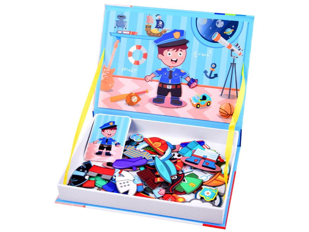 Škatla z moškimi poklici je komplet 59 magnetnih oblačil in dodatkov za oblačenje modela, iz katerih lahko ustvarite nogometaša, vrtnarja, gradbenika itd. Fantastičen ustvarjalni set v trdi kartonski škatli, ki posnema knjigo. Komplet poklicev omogoča otroku, da si sam izbere oblačila za model, lahko pa uporabi tudi namige na karticah, na katerih so fantje v oblačilih, prilagojenih določeni poklici.