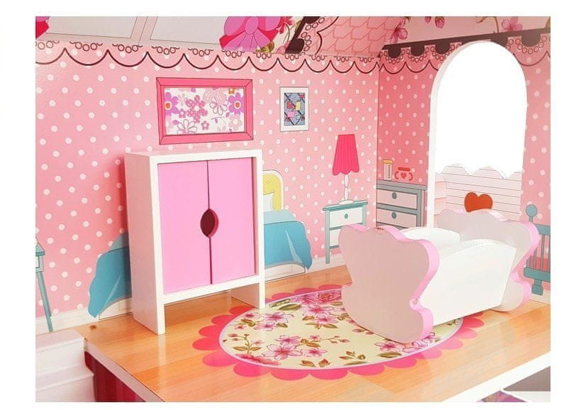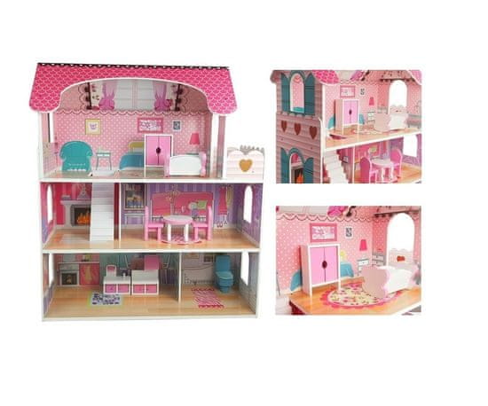Hišica za punčke ima tri nadstropja. V prvem so moderno opremljena kuhinja z vgradnim pohištvom in kopalnica, srednja je namenjena elegantni jedilnici, v mansardi pa je spalnica staršev in zibelka za majhnega otroka. Vse sobe imajo leseno pohištvo, ki ga je mogoče preurediti in okrasiti na novo. Zagotavljamo vam, da bo hišica za punčke Villa Milena malčke zabavala dolge ure in jim ne bo pustila dolgčas.