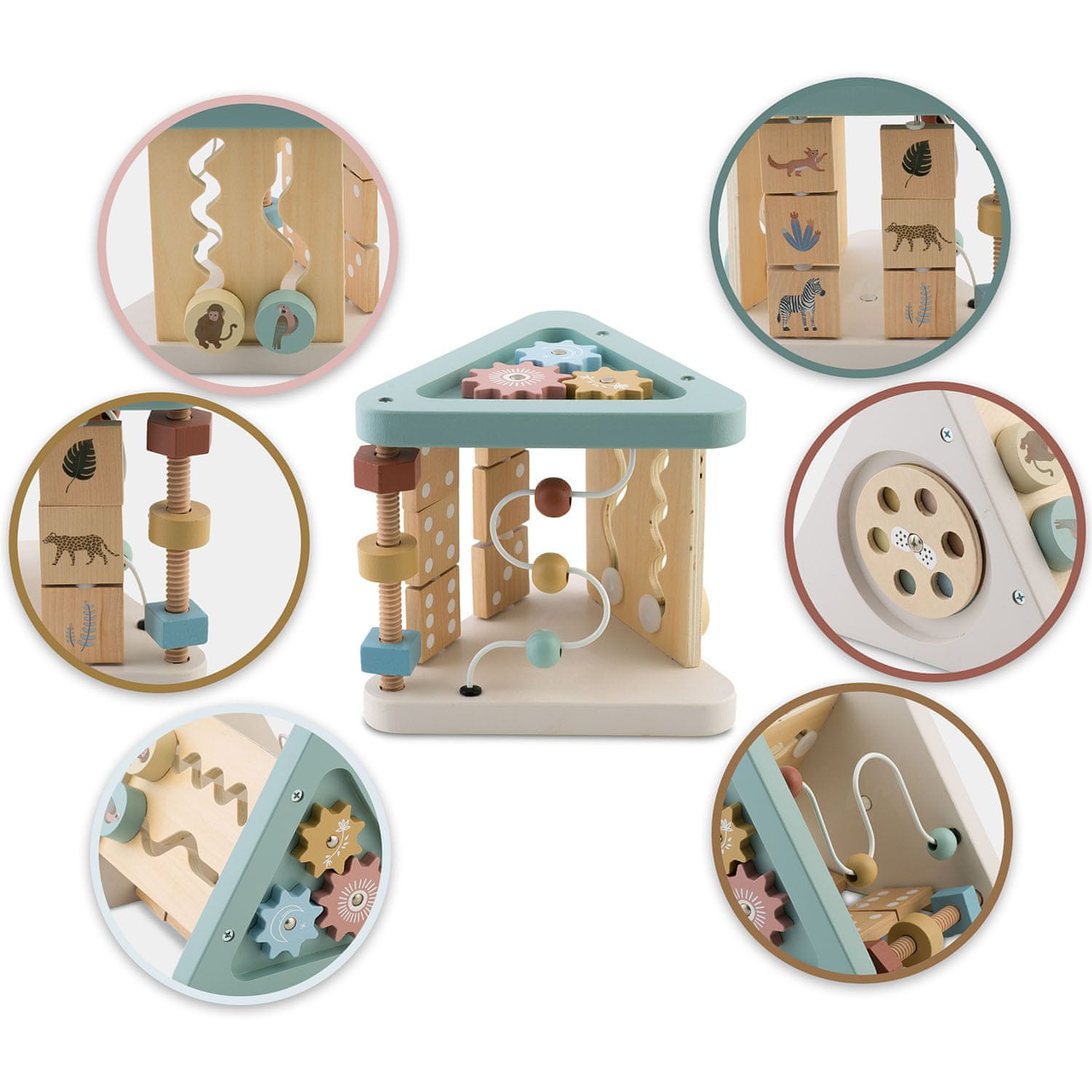 Kocka ima veliko gibljivih delov , različne vrste zobnikov, drsne kroglice, kroglično stezo, gumbe, živalske kocke in vrteče se lesene niti z vijaki. Odlično za razvoj fine motorike!