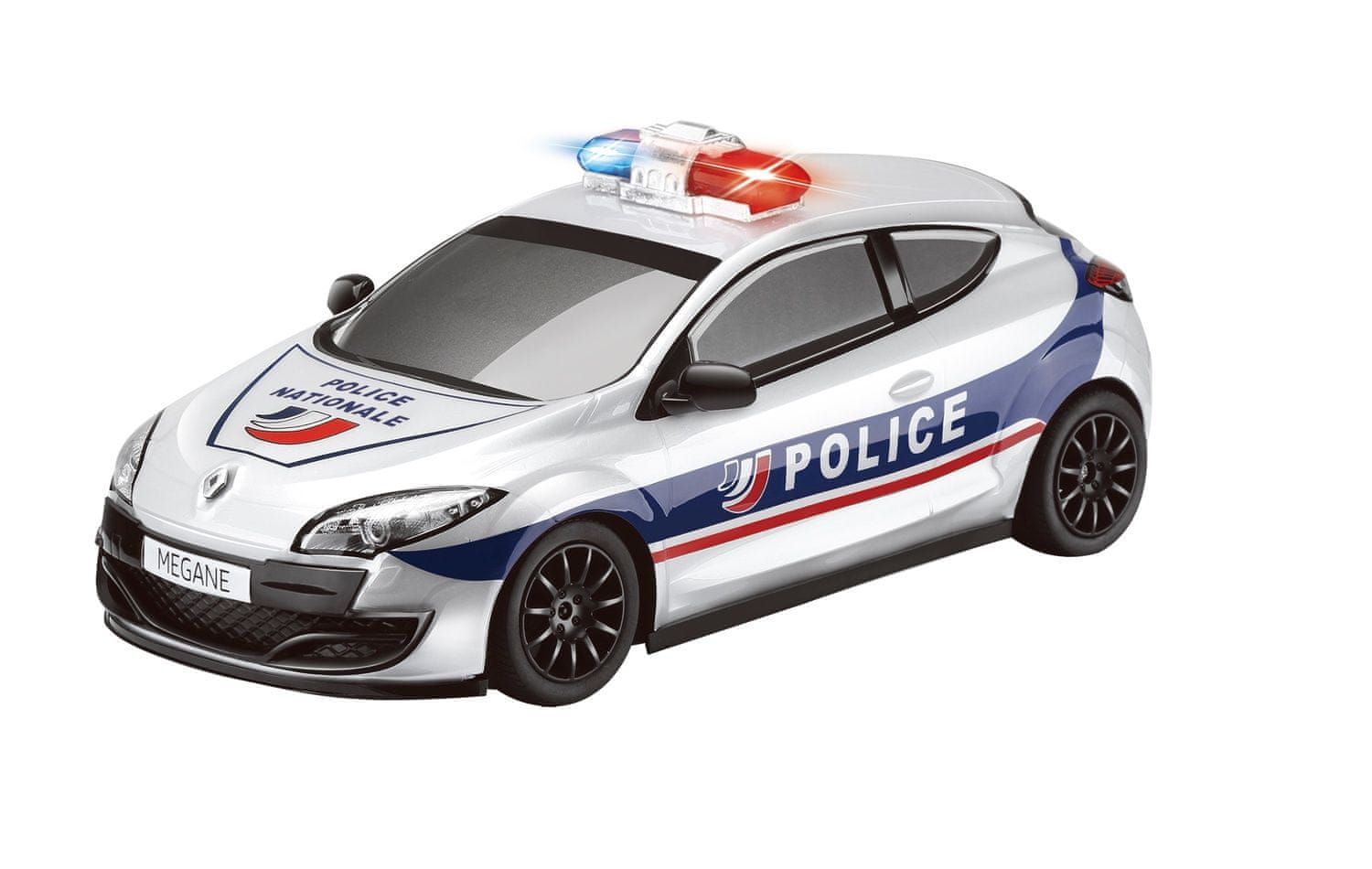 Na kraj dogodka prihiti policijski avto, da zavaruje situacijo! Najvišja hitrost daljinsko vodenega policijskega avtomobila Renault Megane RS je 9 km/h. Ima vzmetenje in delujoče sirene in žaromete. Merilo 1:20. Baterije 5 x AA niso vključene 3+
