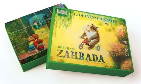 Lesene zložljive kocke s slikami so bile priljubljena igrača že v 19. stoletju, v 20. stoletju pa je prišlo do velikega razcveta proizvodnje in vsi se jih spominjajo iz otroštva. Kocke imajo še vedno svoj čar, in ker najmlajše učijo logičnega razmišljanja, ne smejo manjkati v nobenem kompletu igrač tri- do štiriletnikov. V povezavi s priljubljenimi slikanicami Jiříja Trnke postanejo resnično dragocena igrača in so lahko lep dodatek k Trnkovi knjigi Vrt. Papirnato prevlečena škatla 12 lesenih kock, 1 kocka 38×38×38 mm Izdelano na Češkem na tradicionalen način.