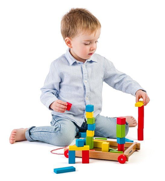 Voziček vsebuje 34 barvnih kock Otrok se nauči razlikovati njihove barve in oblike, z njimi graditi in jih poravnati nazaj v voziček. Igrača razvija fino motoriko in logiko