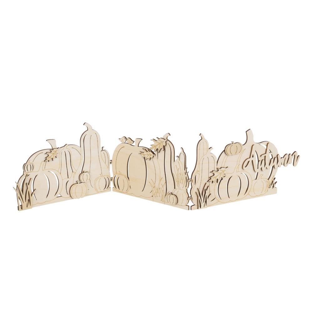 Enostavna montaža! Kulisa iz lesa, ki ga lahko pobarvate in sestavite kot majhen zložljiv zaslon. Vsak od treh delov je dolg 20,2 cm. Skupna dolžina zložljive kulise je približno 48 cm, višina približno 10,5–15 cm, debelina približno 3 mm. Vsebina: 3 lasersko izrezane plošče z motivom buče, 1 lasersko izrezana plošča z motivi za odstranitev in dekorativno nalepitev, npr. listi, buče, gobe, napisi, povezani z jesenjo. Potrebovali boste tudi lepilo (npr. lepilno pero, št. izdelka 33487000), barvo in za osvetlitev LED čajne svečke ali LED niz luči. Pobarvajte 3 deske v obliki buč, z lesene deske odstranite posamezne kose motiva, jih pobarvajte in dekorativno prilepite na tri deske v obliki buč. Po sušenju okrašene kose vstavite z lesenimi tečaji, da dobite majhen zložljiv paravan. Stojalo postane sijajen svetlobni element, ko za njim postavite niz luči LED ali čajne sveče LED. Pozor: Za osvetlitev ne uporabljajte sveč, saj lahko pride do požara!