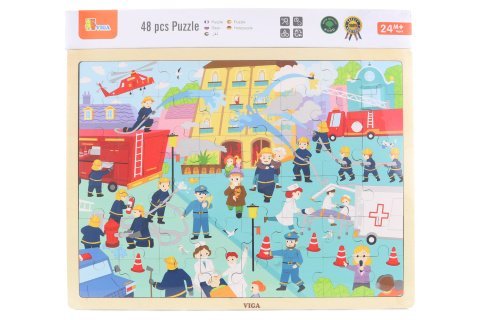 Lesena sestavljanka s sliko gasilcev. Skupaj 48 kosov. Velikost slike je približno 40 × 30 cm. Dimenzije približno 40 × 34,5 × 1 cm. Starost 24m+