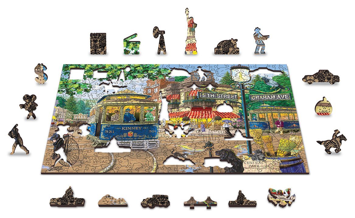 Opomba: fotografije sestavljank so ilustrativne in lahko prikazujejo različico z drugačnim številom kosov. Skupno število kosov je vedno navedeno v imenu izdelka, končna velikost slike in število edinstveno oblikovanih kosov pa v opisu. Lesena sestavljanka WOODEN CITY z laserskim rezanjem in posebej oblikovanimi koščki je izjemno zabavna. Nekateri kosi so izdelani v obliki živali, stavb ali predmetov, katerih končni učinek je še večji zaradi lasersko poudarjenih podrobnosti. Ti kosi lahko stojijo samostojno kot majhne figurice. Uganke z različno oblikovanimi deli so težje in bolj zahtevne kot klasične uganke. Poleg tega je sestavljanka obojestranska in jo je mogoče sestaviti po sliki (sprednja stran) ali po obliki (hrbtna stran z vzorcem). Poleg edinstvenega koncepta sestavljanke blagovna znamka WOODEN CITY ne pozablja na ekologijo, zato pri teh izdelkih ne boste našli plastične embalaže.