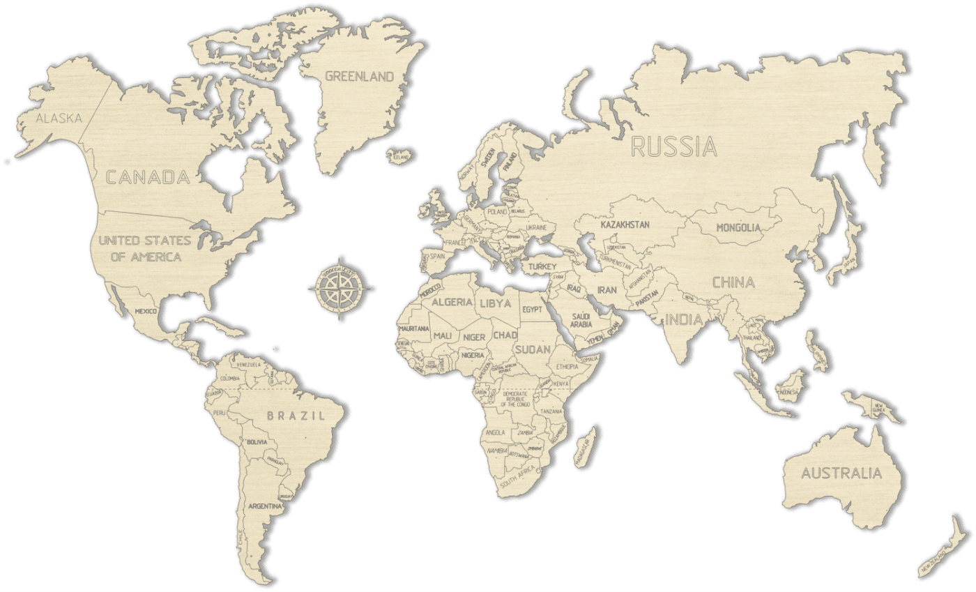 Lesena „sestavljanka“ z zemljevidom celotnega sveta je namenjena predvsem kot dekorativni element ali elegantno darilo ne le za popotnike. Stenski zemljevid bo postal svet spominov, izkušenj in pustolovščin. S pomočjo obojestranskega lepilnega traku ga lahko preprosto namestite doma ali celo v pisarni. Originalni leseni zemljevid sveta je lasersko izrezan iz visokokakovostne vezane breze. Obiskane kraje lahko pobarvate ali v les zabodete zatič z zastavico.