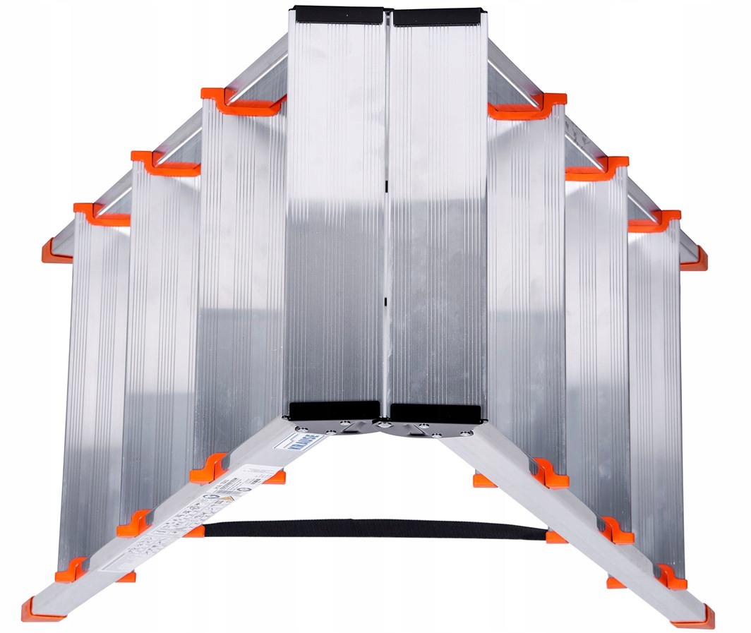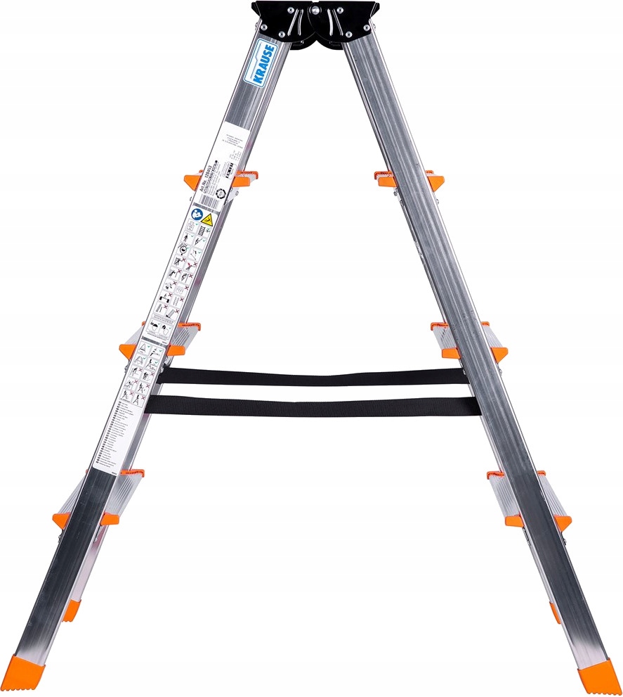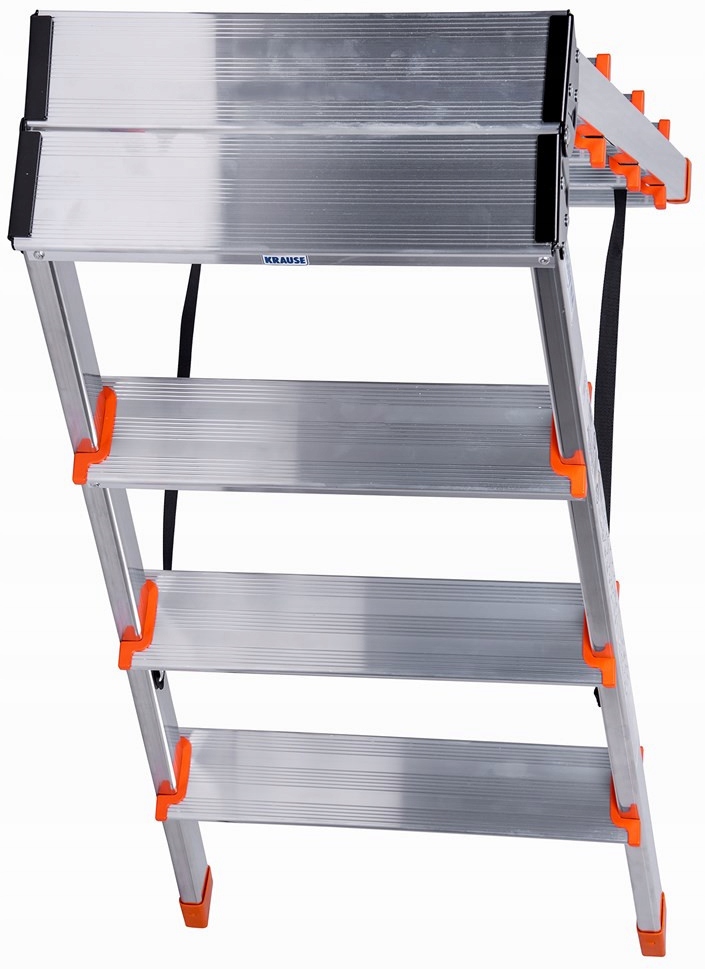 DVOSTRANSKA lestev KRAUSE 2X4 ima tudi 6 stopnic, ki omogočajo delovno višino do 2,40 m. Stopnice so izdelane iz trpežnega, odpornega materiala, njihova povezava z nosilci pa je ojačana s 6 zakovicami, kar zagotavlja večjo stabilnost. Naprava ima tudi nedrseče, oblikovane noge, ki ščitijo tla pred poškodbami in zagotavljajo dodatno stabilnost. Varnostni trakovi, odporni proti trganju, omogočajo varno premikanje lestve na druga mesta.