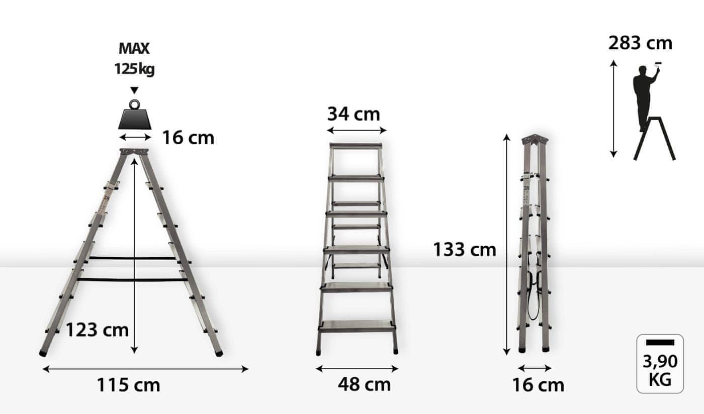 Višina stopnic: 1,33 m Delovna višina: 2,83 m Višina ploščadi: 1,23 m Širina: 0,48 m Nosilnost: 125 kg Material: aluminij Teža: 3,9 kg