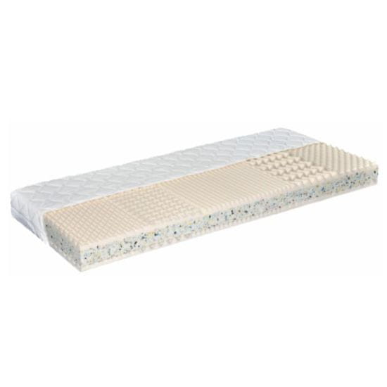 Gumotex vzmetnica MONIKA 90×200 cm je visokokakovostna češka vzmetnica, ki je osredotočena na udobje in podporo celemu telesu od glave do pet. Sestavljen je iz kombinacije dveh PUR pen in RE pene. PUR pena je zelo priljubljena pri izdelavi vzmetnic. Izstopa z odličnimi lastnostmi. Vzmetnica iz PUR pene je na začetku trša, z uporabo postane udobnejša, ne da bi izgubila volumen. Vzmetnice iz PUR pene so zelo priljubljene zaradi svojih ortopedskih in antialergijskih lastnosti. Poleg tega imajo majhno težo, zato je rokovanje z njimi enostavno in preprosto. Največja prednost te pene je odpornost na ležanje, kar je najpogostejši razlog za zamenjavo vzmetnice. RE pena je reciklirana zdrobljena pena, ki je proizvedena s kombinacijo različnih materialov, predvsem hladnih pen, PUR pen in flexifoam pen. Posamezni deli so med seboj povezani s stiskanjem pod visokim pritiskom. RE pena daje vzmetnici večjo togost in s tem poveča njeno nosilnost. Vzmetnica je conska, kar pomeni, da je njena površina razdeljena na več con z različno trdoto in ojačitvijo. Območja vzmetnice so mesta z različno trdoto materiala, ki nudijo tudi različno oporo. To bo preprečilo preležanine na mestih večje obremenitve. Vzmetnica se zelo enostavno prilagodi vašemu telesu. Na voljo je v kvalitetni Aloe prevleki, ki je pralna pri temperaturi 60 °C. Luksuzna prevleka vsebuje mikrokapsule z naravnim izvlečkom aloe vere. Prevleka sprošča aromo z antialergijskimi in antiseptičnimi učinki. Aloe Vera vsebuje encime, minerale in aminokisline, ki učinkovito delujejo na kožo in pomagajo pri njeni regeneraciji. Višina vzmetnice je 14 cm. Največja nosilnost ležišča je 110 kg.