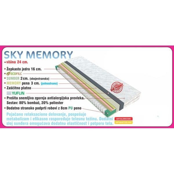 Vzmetnica Memory z žepkastim vzmetenjem in višino 24 cm, ki bo zadovoljila večino uporabnikov. Ponaša se z Memory peno debeline 3 cm, vzmetenje pa je dodatno zaščiteno tudi z ecofilcem in PU peno. Robovi so stransko ojačani za odlično stabilnost. Prešita, snemljiva prevleka vsebuje anti-bakterijske lastnosti in je narejena iz 80% bombaža in 20% poliestra, za udobno spanje brez zbujanja.