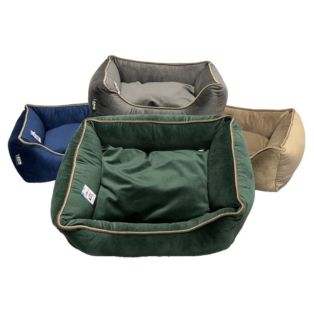 Luksuzna žametna pasja postelja z oblazinjenim robom.