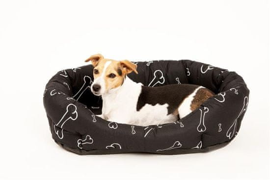Udobna, visokokakovostna postelja iz bombažne tkanine s potiskom kosti in blokov, polnjena z votlimi vlakni. Postelja je na več mestih prešita, da se prepreči neenakomerna porazdelitev polnila. Blazina je odstranljiva. Stranice postelje so izdatno napolnjene za dobro oporo. Postelja je enostavna za vzdrževanje.