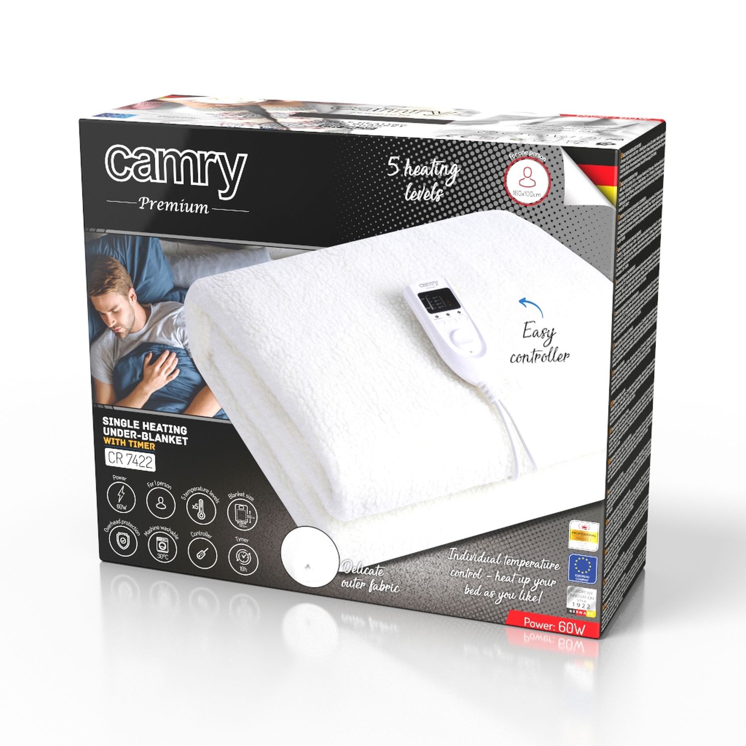 Moč: 60 W | Idealna velikost za eno osebo 160 × 100 cm | Pralno pri 30 °C | Časovnik do 10 ur | Snemljiv napajalni kabel z LCD daljinskim upravljalnikom | 5 stopenj ogrevanja