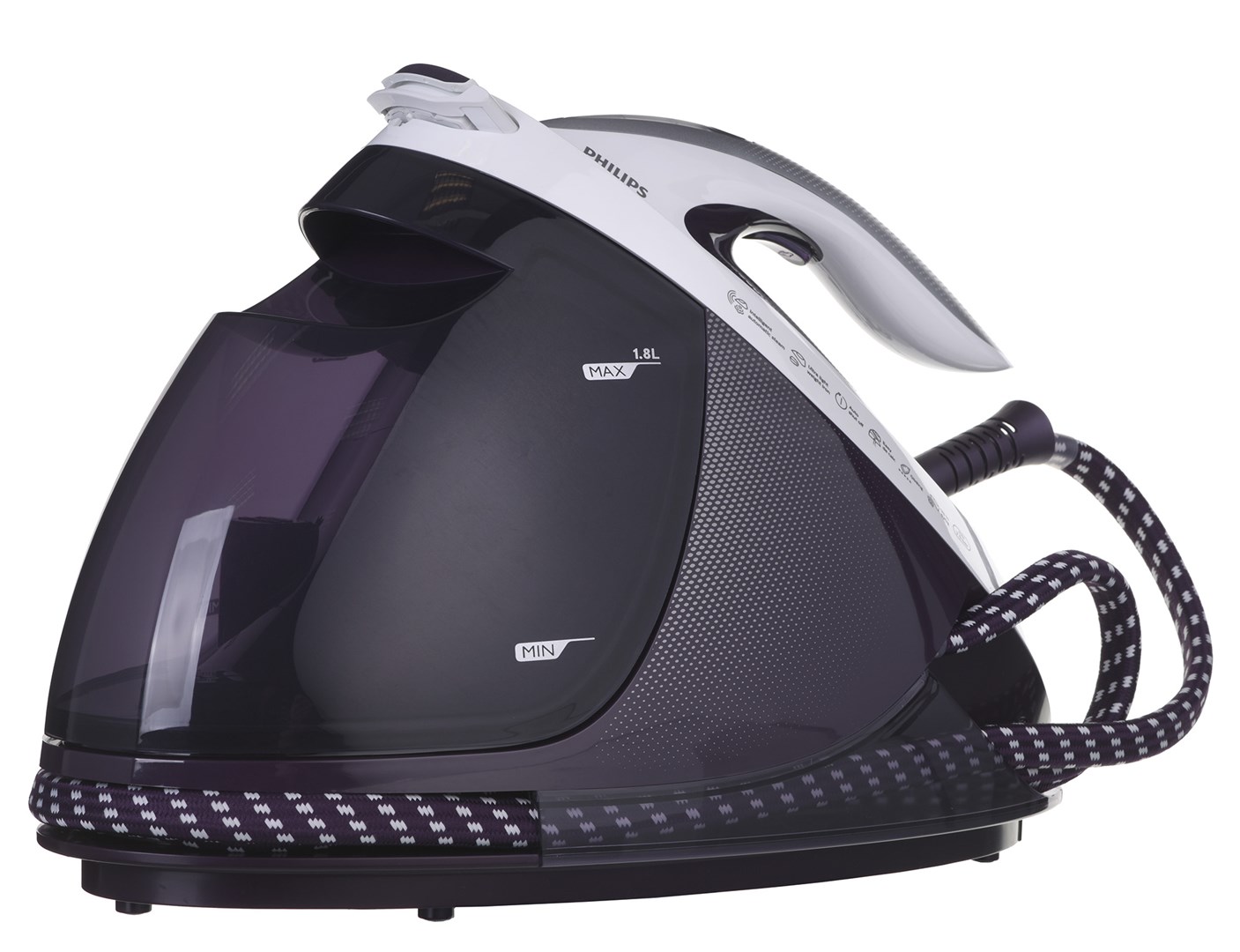 Prozoren 1,8-litrski rezervoar za vodo zagotavlja do dve uri neprekinjenega likanja. Kontrolna lučka zasveti, ko je nivo vode nizek. Rezervoar lahko preprosto napolnite pod pipo tako, da vodo natočite skozi veliko odprtino.
