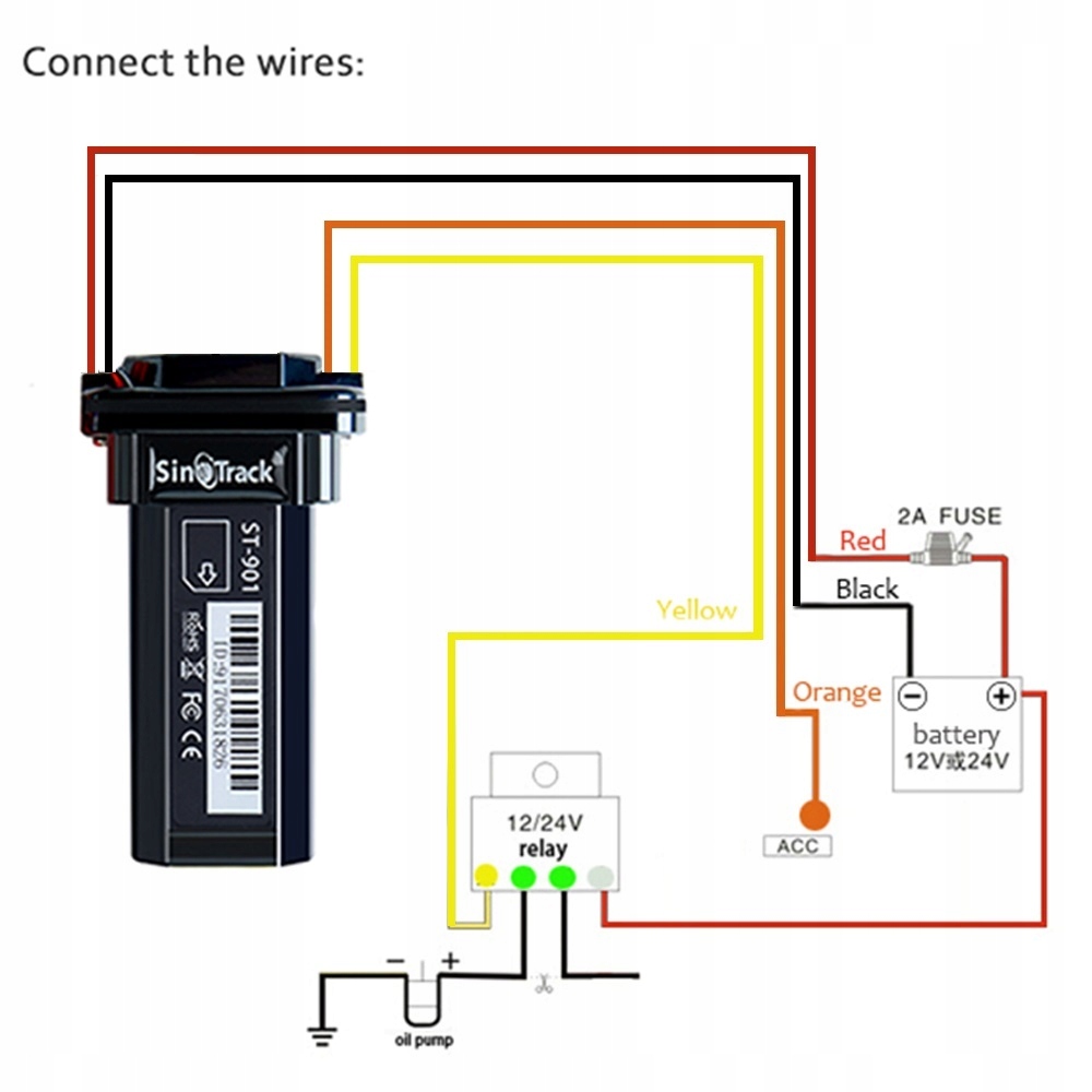 Komplet vsebuje kabelski snop za priključitev – brez pretvornikov itd. Rdečo „+“ in črno „-“ žico priključite na stalno napajanje 12–24V in vstavite SIM kartico. Če želimo imeti vklopljeno funkcijo „alarm za zagon avtomobila“, se tretja žica (ACC) oranžne barve priključi na tok, ki obvešča o zagonu avtomobila (lahko ostane nepriključena ali pa se priključi na osvetlitev ozadja radia ali vžig).