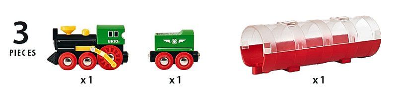 Parni vlak BRIO je klasičnega videza in odraža obdobje pare. Parna lokomotiva z rdečimi kolesi vozi skozi predor kot v času svoje slave. Uživajte v zabavni igri z vsemi tremi predori in vlaki – tovornim, potniškim in parnim (prodajajo se posamično). Predor in vlak je mogoče kombinirati s katero koli železniško progo BRIO. Igrače BRIO so visokokakovostne, ustvarili so jih strokovnjaki, pri čemer je poudarek na varnosti sestavnih delov. Paket vsebuje 3 kose. Starost: 3+. Velikost paketa: 23,5 × 8 × 15 cm. 23,5 × 7,8 × 7,8 cm.