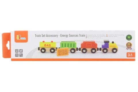 Leseni vlak s 3 vagoni inlesom.Dimenzije vagona in vlakov približno 7 × 4,5 x2,5 cm, povezani z magneti. Dimenzije paketa so približno 34 × 8 × 3,5 cm. Starost 3+