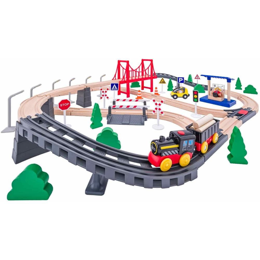 Večnivojska vlakovna proga z mostom z vrvjo in kombinacijo lesenih/plastičnih tirov Komplet vključuje električni vlakec, plastični vagon, postajališče, 2 figurici in druge dodatke Progo je mogoče vsakič zgraditi drugače, posamezne dele pa je mogoče kombinirati z drugimi vlakovnimi kompleti, ki so na voljo na našem trgu
