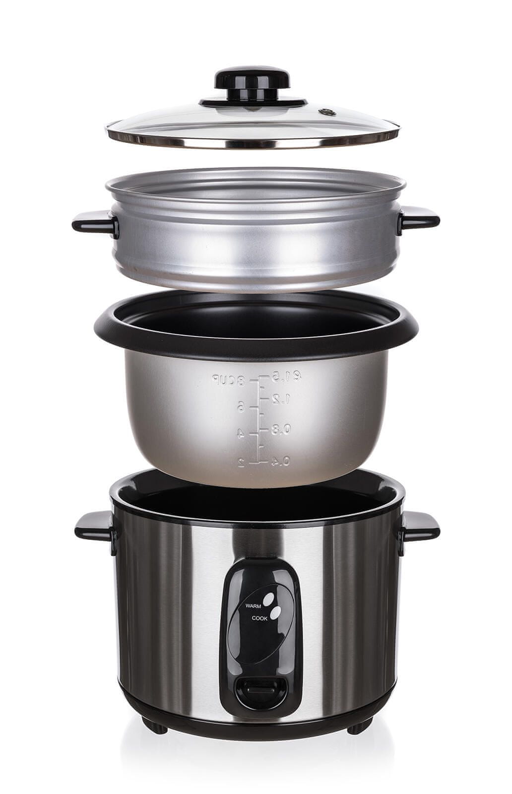 V celoti samodejni rižnik je primeren za pripravo vseh vrst riža, vključno z rižem za suši. Ko je riž pripravljen, se kuhalnik samodejno izklopi in preklopi na funkcijo Keep Warm, ki riž ohranja topel do več ur. Priloženi so merilna skodelica za enostavno polnjenje, zajemalka in nastavek za kuhanje rib ali zelenjave v pari. Notranja posoda ima posebno površino, ki se ne prijema, zato je enostavna ne le za uporabo, temveč tudi za čiščenje. Rižnik ima steklen pokrov z luknjo za uhajanje odvečne pare, praktične ročaje na obeh straneh, luči za delovanje in vzdrževanje temperature ter nedrseče nogice.