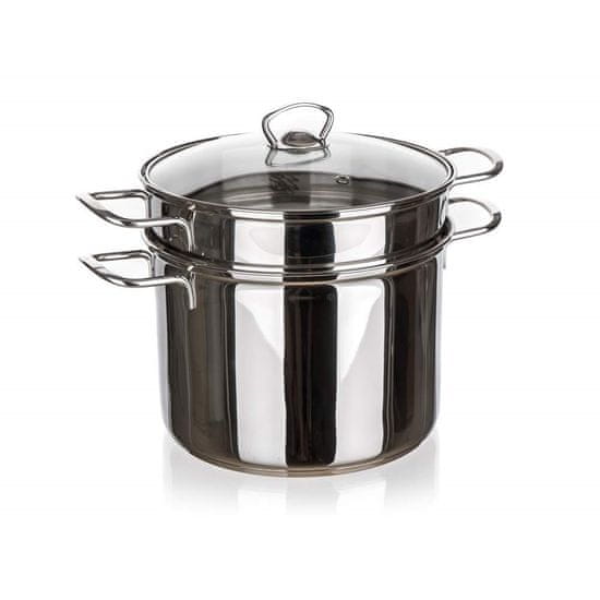 Lonec iz nerjavečega jekla AKCENT je idealen za testenine in kuhanje v sopari ter je izdelan iz visokokakovostnega nerjavečega jekla. Testenine se pripravljajo v perforiranem vložku iz nerjavečega jekla z ročaji, po kuhanju pa jih je zaradi vložka enostavno odcediti, vključuje steklen pokrov z ročajem iz nerjavečega jekla. Lonec s prostornino 5 l lahko uporabljate tudi samostojno za pripravo omake. Lonec ima sendvič dno z odlično toplotno prevodnostjo. Tako je priprava hrane hitrejša, prihranite čas, energijo in s tem tudi denar.