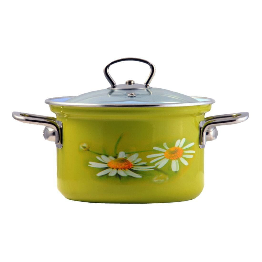 Emajlirani lonec z ročaji iz nerjavečega jekla s prostornino 2,1 l iz kompleta DAISY in cvetličnim okrasjem se lahko uporablja v vsaki kuhinji in je primeren za vse vrste štedilnikov. Lonec je opremljen s steklenim pokrovom.