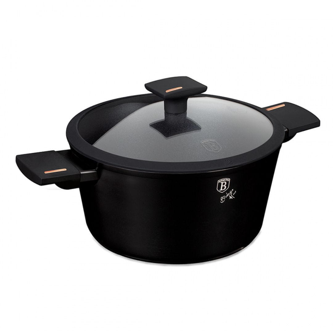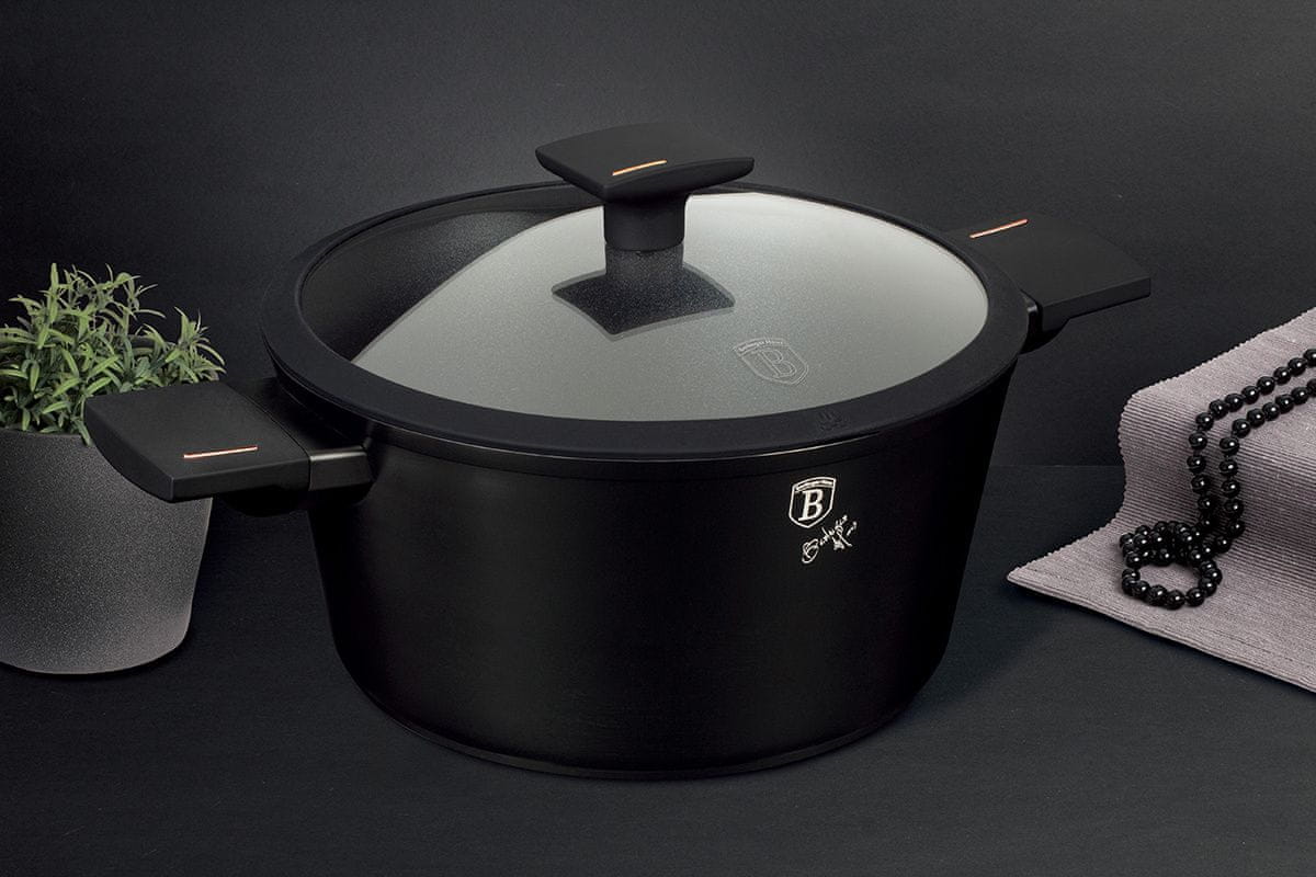 Lonci, ponve in dodatki iz serije MONACO TITAN COLLECTION podjetja BERLINGER HAUS so izdelani iz visokokakovostnega aluminija z izjemno trdo titanovo prevleko v notranjosti. Zunanja prevleka v mat črni barvi. Ta privlačna in modna posoda je serijsko opremljena z ročaji SOFT TOUCH (silikonski ročaj) in steklenimi pokrovi s silikonskim robom za boljšo tesnost. Prilagodljiv za vse vrste štedilnikov: plinski, električni, keramični, halogenski, indukcijski. Sistem TURBO INDUCTION (zelo hitro se segrejejo) prihrani do 35 % energije – Ponev za cvrtje Ø24 × 6,5 cm, 2,3 L – Lonec s pokrovom Ø24 × 11,8 cm, 4,1 L – Plastični pokrov za enostavno shranjevanje v hladilniku – 1 kos.