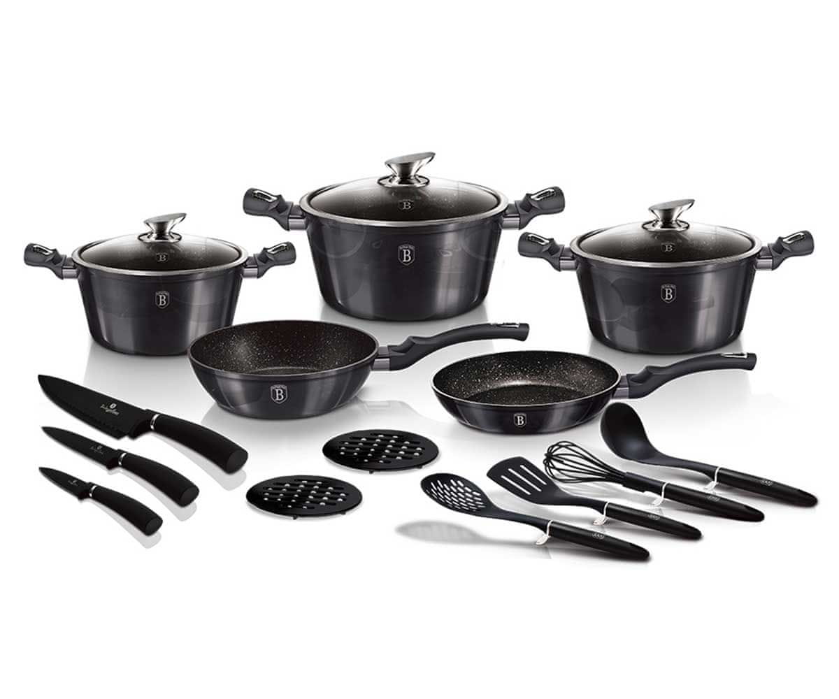 Posoda CARBON PRO proizvajalca BERLINGER HAUS je izdelana iz visokokakovostnega litega aluminija, prevlečenega s trojno granitno prevleko (marmor) z zelo visokim koeficientom trdote. Zunanji premaz je kovinsko grafitne barve. Te privlačne in modne posode so serijsko opremljene s silikonskim ročajem SOFT TOUCH. Prilagodljiv za vse vrste štedilnikov: plinske, električne, keramične, halogenske in indukcijske. Sistem TURBO INDUCTION (zelo hitro se segrejejo) omogoča prihranek do 35 % energije.