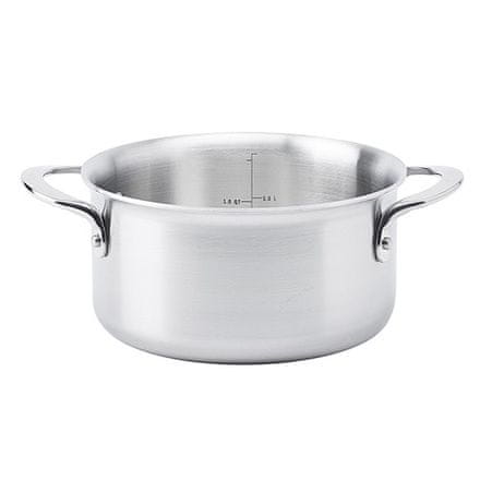Kolekcija ALCHIMY je popolna kombinacija zahtev profesionalnih kuharjev in potreb vsakodnevnega kuhanja. Posoda je enostavna za čiščenje, trpežna in idealna za zdravo kuhanje. Troslojno ohišje zagotavlja enakomerno porazdelitev temperature in vam omogoča popoln nadzor tudi nad najzahtevnejšim kuhanjem. Ta zasnova pomaga zmanjšati porabo energije. Celotna kolekcija ima v notranjosti tehtnico za enostavno uporabo. Udoben, dvignjen in vodoodporen ročaj olajša rokovanje in čiščenje. Ergonomski ročaji so trdno pritrjeni z zakovicami. Površinska obdelava doda eleganco profesionalnemu slogu. Značilnosti: – Izdelano v Franciji – 3-slojna konstrukcija iz nerjavečega jekla (aluminij na sredini), enakomerna porazdelitev toplote – notranja plast iz nerjavečega jekla 18/10 – Gladka brušena površina – Merilna lestvica v notranjosti lonca – Ukrivljen rob za natančno in enostavno vlivanje tekočin – Dva ročaja z vtisnjenim logotipom kupca – Etiketa,