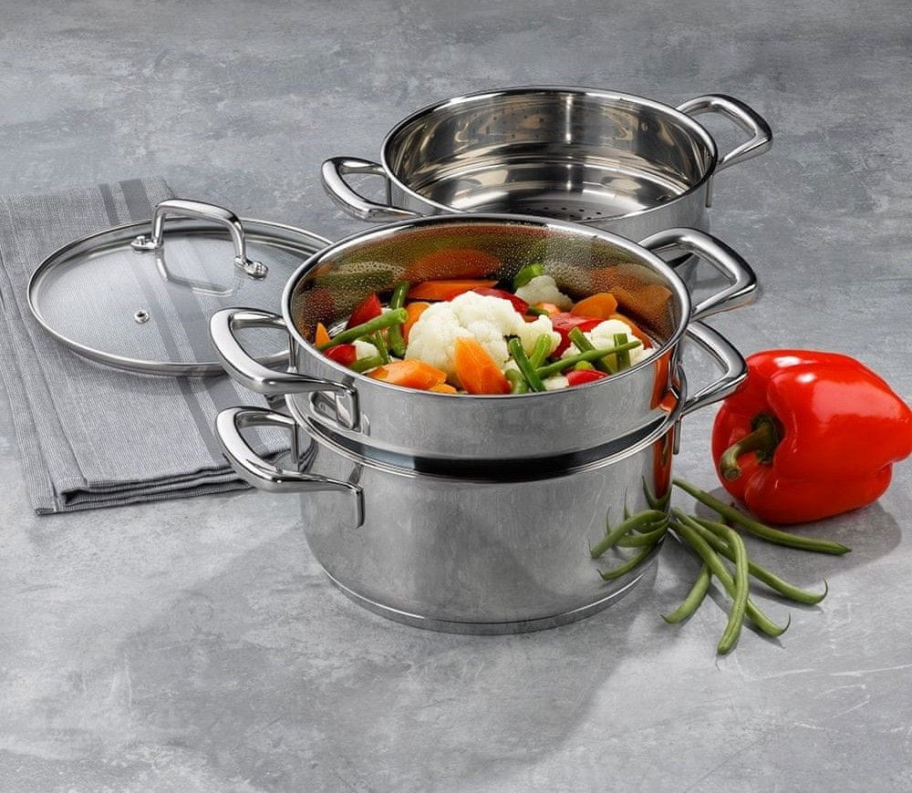 Kotliček za kuhanje na pari s pokrovom iz nerjavečega jekla 18/10 FLAVORIA 20 cm set 4 bo vaš zvesti pomočnik v kuhinji